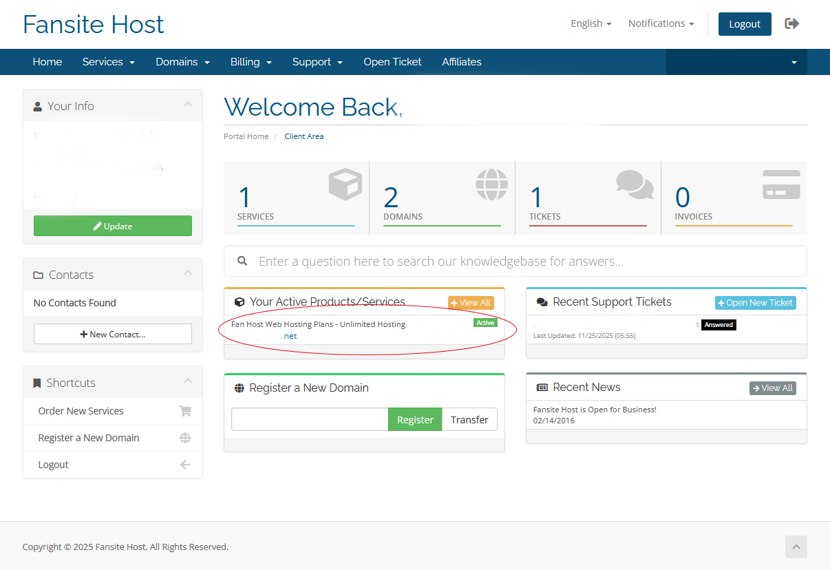 See the images below for reference on how to login to cpanel using the Client Area at fansitehost.com/clients/